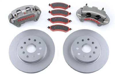 The TeraFlex JK Front Big Brake Kit is designed as a factory brake upgrade for JK owners looking for a performance brake package that will handle the increased braking requirements needed after larger wheels and tires are used. The simple bolt-on upgrade installation requires no cutting, welding or adapter bracketry. The big brake kit features oversized 56mm dual piston calipers for increased clamping force and surface area. The 13.3” Mill-balanced vented rotor provides greater braking leverage to allow stopping distance to be decreased substantially and decreases heat buildup. The rotors also feature two wheel bolt patterns - 5x5" and 5x5.5". The Composite-resin, semi-metallic pads have excellent cold stopping power resulting in maximum initial speed scrub, increase pad life and reduce noise & dust. Note: A minimum of 17” diameter wheels must be run with the big brake kit.
