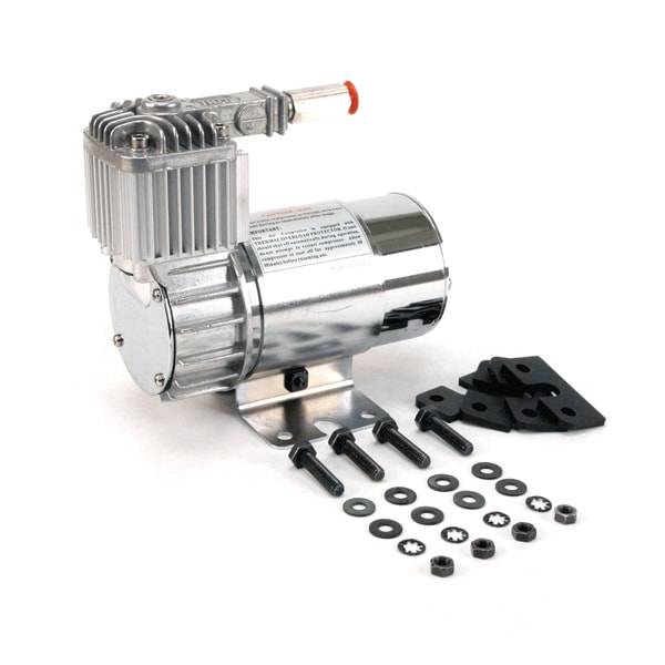 VIAIR’s 100 Series with omega-style bracket is a bare compressor that comes standard with a chrome motor housing and chrome end plates. Insulated wiring is pre-installed. This compressor does not come equipped with a leader hose but does come with an inline check valve.
