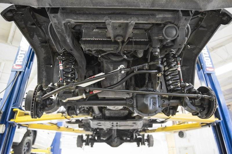 In the rear, in addition to the dual rate coils and new shocks, a rear track bar bracket is included to center the axle. The new bracket bolts directly to the original axle mount and only requires a couple of small holes to be drilled for installation. The bracket properly adjusts the rear roll center height and keeps the track bar flat, which helps eliminate any unwanted lateral motion in the rear when hitting bumps. Bump stop extensions are also included to provide necessary clearance at full suspension compression.