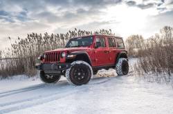 with the first of several lift systems to hit the shelves ready to ship. These new 2" lift systems are designed for improved on-road ride quality and offroad capability with clearance for 35" tires. Designed to not only lift, but enhance the new Wrangler JL's all around performance, these new 2" systems come complete and ready to perform right out of the box. At each corner replacement JL-specific ProRide coil springs are supplied to mimic the factory ride and spring rate. These springs provide additional ride height, along with allowing for increased suspension travel over coil spacer kits on the market. They are paired with specially tuned NX2-gas shocks to offer a smooth ride and split second response to changes in the terrain with 10-stage velocity sensitive valving. These high pressure nitrogen gas charged shocks offer a huge improvement over the factory shocks and kits with shock extension brackets. Along with the new coil springs and gas shocks, these 2" kits include front and rear bump stop extensions to properly limit suspension up travel. Up front the front axle is repositioned forward to correct caster using a set of lower control arm cam locks. JKS quicker disconnects are supplied with the kit to unlock the front suspension's potential to flex while maintaining quiet on road operation with a heavy duty adjustable design and spherical bushings. Along with the sway bar disconnects bolt-on mounting posts are supplied for each side to easily store the sway bar up out of the way when hitting the trail. In the rear extended length sway bar links are supplied to keep the sway bar at the optimal operating angle and allow more droop travel when paired with the rear NX2 shocks. Finishing out the rear of this kit is a 2-piece rear track bar bracket to recenter the rear axle under your new Wrangler JL while improving the operating angle for improved roll center geometry.