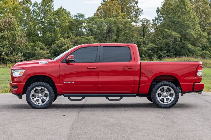 Innovative adjustable design. It's time to put your lifted vehicle a step ahead of the others! Rough Country's new SRX2 Side Steps are the perfect upgrade for your Ram 1500. Constructed with an innovative slotted rail system, our hoop steps are easily adjustable. Simply slide the footpad left or right along the rail until it is at the perfect position to hop in and out.