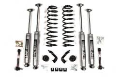 These 2" leveling kits are a step up from the competition, offering better on-road and off-road performance with room for 35" tires. These systems replace the factory coil springs with full length ProRide coil springs to provide 2" of lift up front to level the stance, improved wheel travel and allow full coil bind. Ride quality is enhanced with your choice of specially tuned NX2 gas series or FOX 2.0 performance series IFP shocks (coming soon) at each corner offering split second response to changes in the terrain with velocity sensitive valving. In additional to coil springs and shocks, these 2" leveling kits include front bump stop extensions to properly limit up travel of the suspension. To further improve on the factory suspension, these kits replace the factory sway bar links with (JKS) quicker disconnects to correct the sway bar operating angle while allowing you to easily disconnect the front sway bar to improved articulation offroad. The disconnects include mounting post hardware as well as retaining posts to hol the sway bar up out of the way when disconnected.