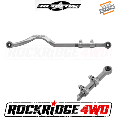 The new Rubicon Express JK/JL Wrangler and JT Gladiator heavy-duty front forged track bar features a heat treated steel construction designed to eliminate deflection caused by oversized tires or extreme side load. It features an adjustable sleeved collar which allows for precise axle alignment while still on the vehicle preventing the need to disassemble the suspension as well as OE style bushings to optimize handling and control.