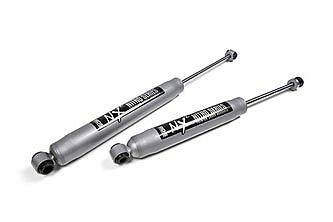 These NX² shocks give high-end performance at an affordable price. They use a pressurized nitrogen charged twin-tube design with 10-stage velocity sensitive valving for lightning fast dampening adaptive to whatever terrain you find yourself traversing on or off-road. The 2" bodied shocks use a large 1-3/8" fluon banded piston, self lubricating seals and a 14mm hardened chrome shaft to help resist rock chips and corrosion. The ends are dual welded for increased strength. Polyurethane bushings and metal sleeves are included to make swapping over your shocks a breeze. These shocks are offered in various stem and eyelet bushing configurations for custom applications and available to work with all current BDS lift kits. The exterior of the shocks are finishes in a durable metallic silver paint with NX² branded decals.