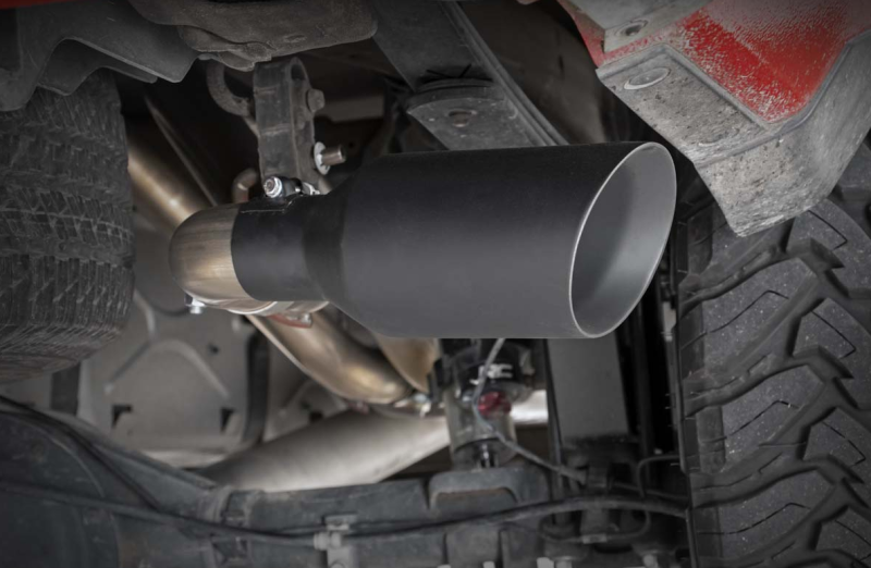 Rough Country Dual Cat-Back Exhaust Systems feature a set of high-temp resistant, dual-wall 304 black stainless tips with RC logo for an improved, aggressive look. Upgrading your exhaust note has never been easier! Each kit conveniently installs onto the factory hangers and features stainless clamps for easy assembly with no welding required!