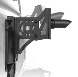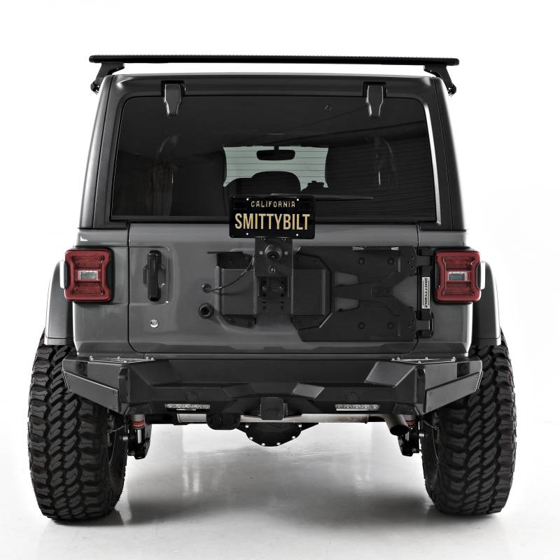 Smittybilt is proud to introduce their new Pivot Heavy Duty Oversized Tire Carrier and Tailgate Reinforcement System that is engineered to hold up to a 40-inch spare tire. The monoblock aluminum construction is combined with forged chromoly mounting brackets for the ultimate in strength to eliminate tailgate sagging and rattles, even while holding up to 135 pounds. The new Pivot Heavy Duty Oversized Tire Carrier triangulates the tailgate mounting and body tub hinge points using existing mounting holes to distribute loads across a wide area while maintaining the easy single action opening and closing of the tailgate.
