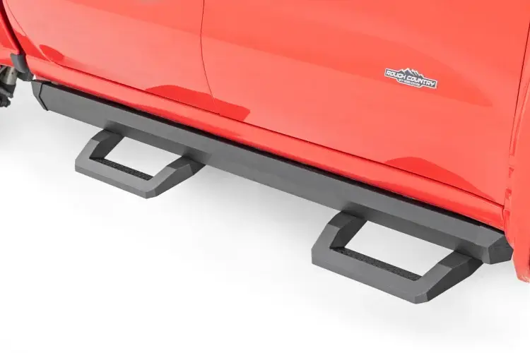 Innovative adjustable design. It's time to put your lifted vehicle a step ahead of the others! Rough Country's new SR2 Side Steps are the perfect upgrade for your Chevy/GMC truck. Constructed with an innovative slotted rail system, our hoop steps are easily adjustable. Simply slide the footpad left or right along the rail until it is at the perfect position to hop in and out.