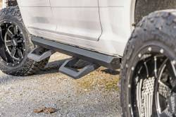 Innovative adjustable design. It's time to put your lifted vehicle a step ahead of the others! Rough Country's new SR2 Side Steps are the perfect upgrade for your Ram truck. Constructed with an innovative slotted rail system, our hoop steps are easily adjustable. Simply slide the footpad left or right along the rail until it is at the perfect position to hop in and out.