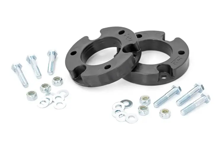 Rough Country's spacer design allows for clearance between the upper control arm and the strut. This leveling kit is easy to install, with no need to disassemble your factory strut and a 100% bolt-on installation process that can be done in no time flat using common tools in a home garage! Includes Rough Country’s Lifetime Replacement Guarantee!