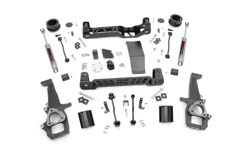 Give your RAM 1500 the perfect blend of performance, protection, and style with Rough Country's 4-inch Suspension Lift. Designed to offer an affordable way to maximize off-road performance and run up to 35-inch tires, these kits offer high quality, heavy-duty equipment for new model RAM 1500’s. Utilizing heavy-duty, laser cut, steel equipment engineered by Rough Country, these 4-inch Suspension Lifts are complete kits that include everything needed for outstanding off-road performance. High-clearance front and rear cross-members provide enough room for off-road climbs and runs. A heavy-duty skid plate shields the vehicle’s differential, protecting you from hazardous terrain. A durable set of driver and passenger side lifted cast knuckles are also included, helping to promote proper geometry once the vehicle is lifted. For true trailblazers, this kit also ships with a set of rear N3 Nitrogen-charged shock absorbers - valved specifically for a blend of on and off-road performance. Includes Rough Country's Lifetime Replacement Guarantee!