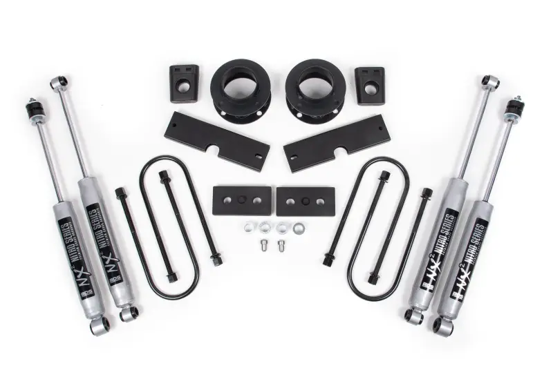 Level the front of your 2013-2026 RAM 3500 4WD truck by installing this 2-inch lift kit from BDS. Works on air ride equipped trucks only. Designed to improve stance this kit includes everything necessary to set your truck up right with clearance for up to 35" tires at an affordable price. The lift kit includes steel fabricated coil spacers, extended bump stops, rear lift blocks, air bag spacer, and custom-tuned NX2 Nitro or FOX 2.0 Performance series shocks.